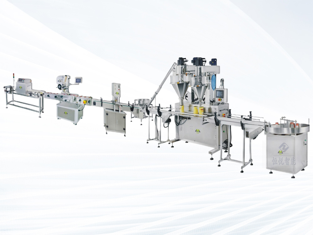 ⑵.粉剂灌装生产线集机、电、光、仪于一体能够实现自动理瓶、输送、上料、计量、定位、充填、上盖、旋盖、贴标、打码等功能。